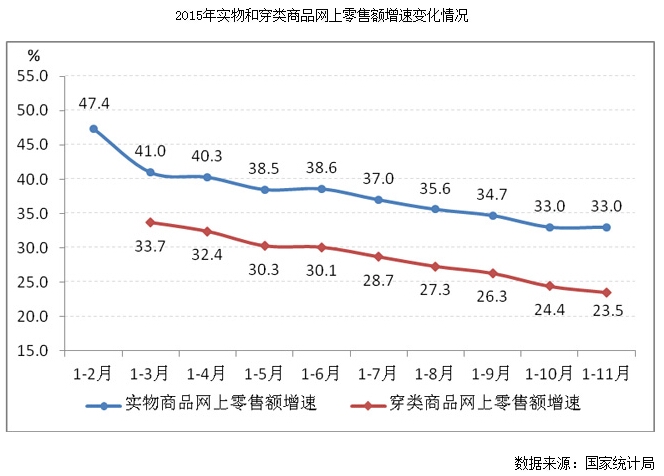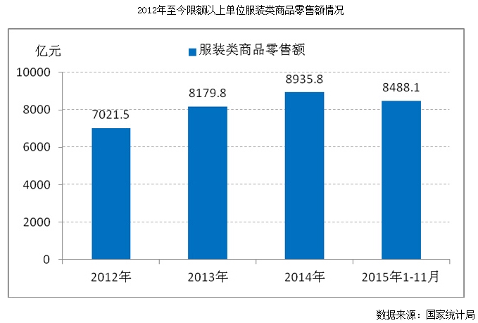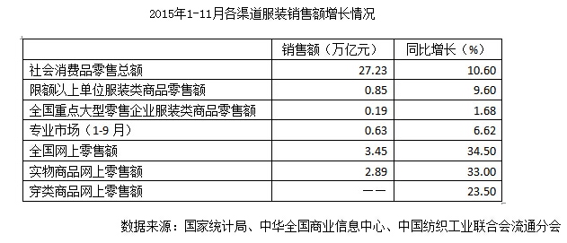 中華商業(yè)信息中心的數(shù)據(jù)顯示,2015年1-11月,全國重點(diǎn)大型零售企業(yè)服裝類商品零售額1921.48億元,同比增長1.68%;各種服裝銷售量4.2億件,同比增長4.77%。2015年1-9月,中國紡織工業(yè)聯(lián)合會(huì)流通分會(huì)重點(diǎn)監(jiān)測(cè)的45家市場(chǎng)總成交額達(dá)到6309.70億元,同比增長6.62%。國家統(tǒng)計(jì)局統(tǒng)計(jì),1-11月穿類實(shí)物商品網(wǎng)上零售額同比增長23.5%。