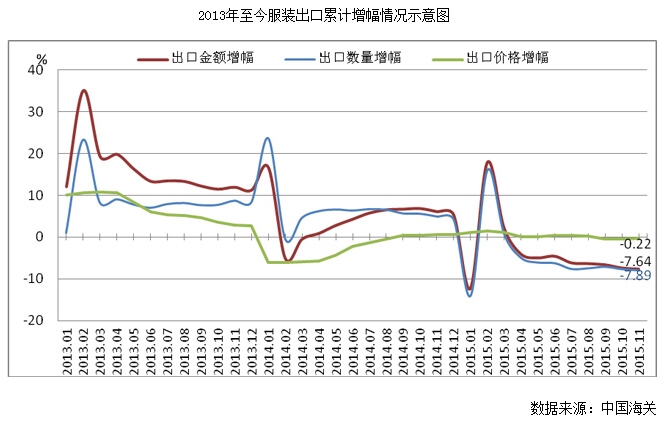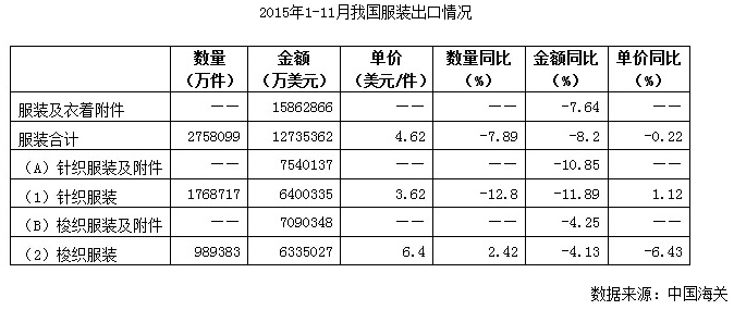 根據(jù)海關(guān)統(tǒng)計(jì),2015年1-11月,我國累計(jì)完成服裝及衣著附件出口1586.29億美元,出口數(shù)量為275.81億件,同比分別下降7.64%和7.89%,服裝出口平均單價(jià)4.62美元/件,同比下降0.22%。