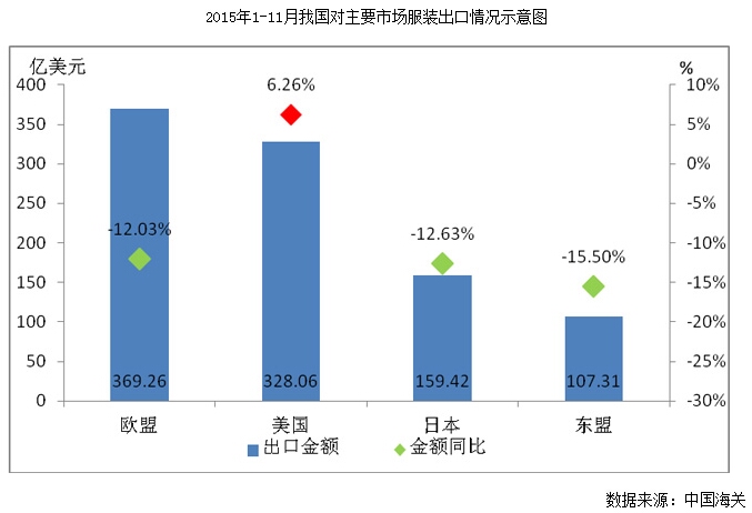 在四個(gè)主要出口市場(chǎng)中,受美國經(jīng)濟(jì)平穩(wěn)恢復(fù)、消費(fèi)支出逐步增長的帶動(dòng),2015年1-11月,我國服裝對(duì)美國出口保持小幅增長,出口數(shù)量57.23億件,同比增長8.35%,出口金額328.06億美元,同比增長6.26%,對(duì)整體出口形成1.13個(gè)百分點(diǎn)的正向拉動(dòng)。對(duì)歐盟、日本和東盟出口金額和出口數(shù)量均出現(xiàn)兩位數(shù)下跌,出口金額同比分別下降12.03%、12.63%和15.5%,出口數(shù)量同比分別下降11.78%、12.30%和12.35%。美國、歐盟、日本和東盟四大主要市場(chǎng)服裝出口964.06億美元,同比下降7.12%。
