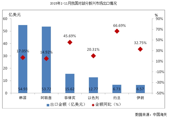 盡管2015年1-11月我國服裝出口整體疲弱,但受“一帶一路”戰(zhàn)略實(shí)施和中非合作發(fā)展深化的影響,我國對(duì)部分新興市場(chǎng)出口實(shí)現(xiàn)快速增長,新的出口市場(chǎng)正在開拓和培育。根據(jù)海關(guān)統(tǒng)計(jì)數(shù)據(jù),2015年1-11月我國對(duì)非洲服裝出口同比增長10.84%,占出口總金額的比重為5.78%,較2014年同期提高0.96個(gè)百分點(diǎn);“一帶一路”沿線國家中,我國對(duì)韓國、阿聯(lián)酋、菲律賓、以色列、約旦、伊朗服裝出口金額增幅分別為17.05%、14.92%、45.69、20.31%、66.69%和32.75%。但五國合計(jì)出口金額150.34億美元,僅占我國出口總金額的9.48%,對(duì)出口總體情況影響甚微。