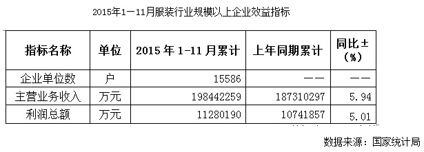 根據(jù)國家統(tǒng)計(jì)局統(tǒng)計(jì)顯示,2015年1-11月服裝行業(yè)規(guī)模以上企業(yè)15586家,累計(jì)實(shí)現(xiàn)主營業(yè)務(wù)收入19844.23億元,同比增長5.94%;利潤總額1128.02億元,同比增長5.01%,行業(yè)效益規(guī)模繼續(xù)擴(kuò)大。服裝行業(yè)規(guī)模以上企業(yè)利潤增速明顯高于全國工業(yè)企業(yè)和制造業(yè)的利潤增速。