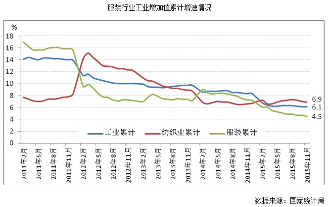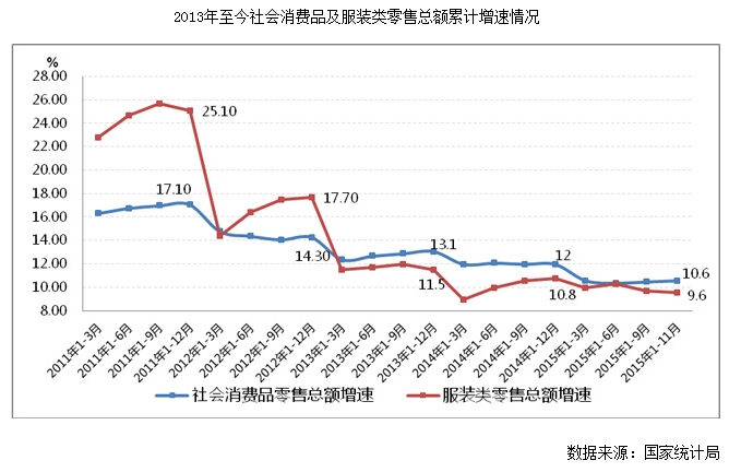 國家統(tǒng)計(jì)局?jǐn)?shù)據(jù)顯示,2015年1-11月份,服裝類商品零售額增速低于社會(huì)消費(fèi)品零售總額增速1.0個(gè)百分點(diǎn),較上年同期回落1.3個(gè)百分點(diǎn)。2013年以來,服裝類商品零售總額增速一直低于社會(huì)消費(fèi)品零售總額的增速,內(nèi)需支撐行業(yè)發(fā)展的動(dòng)力不足。
