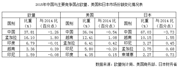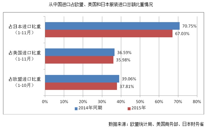 根據(jù)歐盟、美國和日本的服裝進(jìn)口最新數(shù)據(jù),中國占?xì)W盟、美國和日本三大市場(chǎng)服裝進(jìn)口額的比重逐年下降,分別較2014年同期下降1.26、0.62和3.73個(gè)百分點(diǎn),2010年以來累計(jì)下降達(dá)7.85、3.20和15.14個(gè)百分點(diǎn)。