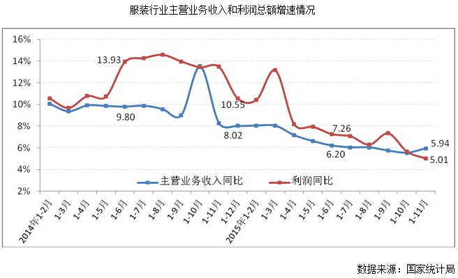 根據(jù)國家統(tǒng)計(jì)局統(tǒng)計(jì)顯示,2015年1-11月服裝行業(yè)規(guī)模以上企業(yè)主營業(yè)務(wù)收入增速較2014年同期回落2.33個(gè)百分點(diǎn);利潤總額增速較2014年同期下降8.46個(gè)百分點(diǎn),行業(yè)整體效益增速放緩。
