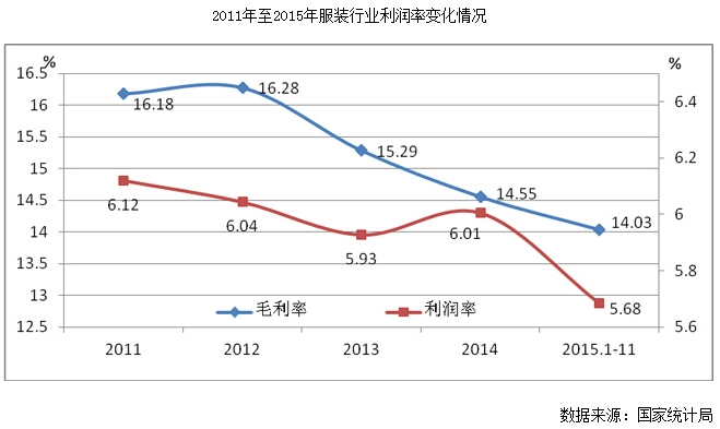 2015年,在行業(yè)發(fā)展速度趨緩的同時(shí),行業(yè)整體盈利能力略有下降,企業(yè)分化進(jìn)一步加劇。2015年1-11月,服裝行業(yè)規(guī)模以上企業(yè)銷售利潤率和銷售毛利率為5.68%和14.03%,分別比2014年同期下降0.05和0.20個(gè)百分點(diǎn),說明企業(yè)盈利能力面臨壓力。
