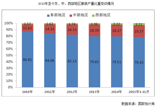 產(chǎn)業(yè)區(qū)域格局進(jìn)一步調(diào)整,東部沿海和內(nèi)陸各地區(qū)產(chǎn)業(yè)分工逐漸清晰,梯度轉(zhuǎn)移繼續(xù)推進(jìn)。從投資中的新開工項(xiàng)目數(shù)看,西部地區(qū)新開工項(xiàng)目數(shù)同比增長31.98%,增速高于東部和中部地區(qū)。從產(chǎn)量來看,東部和中部地區(qū)產(chǎn)量基本穩(wěn)定,西部地區(qū)產(chǎn)量快速增長。2015年1-11月西部地區(qū)完成服裝產(chǎn)量同比增長45.86%,占全國服裝總產(chǎn)量的比重為3.21%;服裝產(chǎn)量增速前10名省市中西部地區(qū)占據(jù)7席。西部地區(qū)服裝產(chǎn)量所占比重也從2010的1.57%增至3.21%,提高1.64個(gè)百分點(diǎn)。