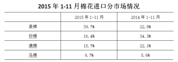 2015年我國(guó)累計(jì)進(jìn)口棉花147.5萬(wàn)噸,同比下降40%。由于2015年配額發(fā)放數(shù)量?jī)H89.4萬(wàn)噸,并且集中在國(guó)營(yíng)貿(mào)易企業(yè)和大型紡紗企業(yè),這些企業(yè)資金實(shí)力較為雄厚,集中在上半年采購(gòu)進(jìn)口棉。從進(jìn)口棉品種看,美棉是進(jìn)口棉中占比最大的,約占40%,其次是印度棉,但印度棉數(shù)量同比下降較大,同比下降71.8%,主要原因是美棉從性?xún)r(jià)比上由于印度棉,印度棉在質(zhì)量上優(yōu)勢(shì)不明顯。