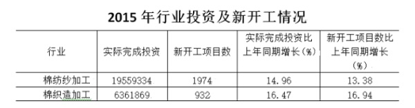 盡管行業(yè)發(fā)展形勢(shì)艱難,但國(guó)內(nèi)棉紡織投資狀況良好,尤其新疆投資熱潮仍未退卻,企業(yè)轉(zhuǎn)型技改積極推進(jìn),2015年我國(guó)棉紡紗織造完成投資額2592億元,同比增長(zhǎng)15.3%,新開(kāi)工項(xiàng)目數(shù)2906個(gè),同比增長(zhǎng)14.5%。投資數(shù)據(jù)作為衡量行業(yè)發(fā)展信心指數(shù)的重要指標(biāo),可以判斷棉紡織行業(yè)不遺余力對(duì)產(chǎn)能提升做出的努力。