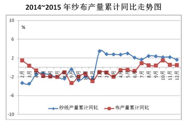 從調(diào)研了解,全國(guó)開(kāi)工率約為八成,部分地區(qū)仍有停產(chǎn)、限產(chǎn)的現(xiàn)象,骨干優(yōu)勢(shì)企業(yè)生產(chǎn)基本穩(wěn)定,從產(chǎn)品產(chǎn)量上看,較2014年略有下降。從中棉行協(xié)跟蹤的全國(guó)骨干企業(yè)的產(chǎn)量數(shù)據(jù)要略好于全國(guó),跟蹤企業(yè)紗產(chǎn)量低速增長(zhǎng),2015年紗產(chǎn)量同比增長(zhǎng)1.65%,全年同比增速整體回落;布產(chǎn)量上半年持續(xù)負(fù)增長(zhǎng),自第三季度小幅回升,全年累計(jì)布產(chǎn)量同比增長(zhǎng)1.23%。