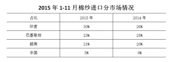 2015年,進(jìn)口紗進(jìn)口國(guó)內(nèi)的速度繼續(xù)升溫,全年累計(jì)進(jìn)口棉紗線(xiàn)234萬(wàn)噸,同比增加16.9%,其中仍以印巴紗為主,此外越南紗進(jìn)口數(shù)量增長(zhǎng)迅速。值得關(guān)注的是,進(jìn)口紗中精梳30-47支紗數(shù)量增長(zhǎng)明顯,以印度30-47支精梳紗數(shù)量最大,同比增長(zhǎng)106.7%,其次該品種的越南紗增長(zhǎng)達(dá)128.8%,越南紗快速增長(zhǎng)的主要原因還是國(guó)內(nèi)產(chǎn)能轉(zhuǎn)移至越南,其紗線(xiàn)回流至國(guó)內(nèi)市場(chǎng),中國(guó)仍是全球紗線(xiàn)主要的消費(fèi)市場(chǎng)。另外,我國(guó)自保稅區(qū)進(jìn)口的國(guó)產(chǎn)棉紗數(shù)量占比下降3個(gè)百分點(diǎn),是與海關(guān)對(duì)加工貿(mào)易“一日游”監(jiān)管力度加大有關(guān)聯(lián)。