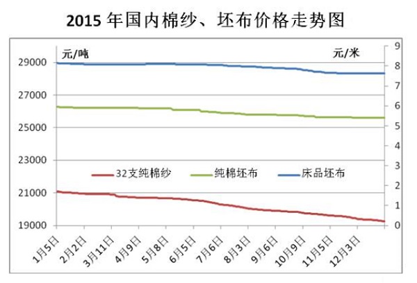 受棉花價(jià)格弱勢(shì)、市場(chǎng)需求不足的影響,國(guó)內(nèi)涉棉的紗布產(chǎn)品價(jià)格全年下行,從調(diào)研中了解到,國(guó)產(chǎn)棉紗常規(guī)品種還受到進(jìn)口紗低的壓制,價(jià)格提升困難,再加上下游客戶(hù)端的頻發(fā)壓價(jià),企業(yè)難以消化高成本,不得不放棄訂單。相比棉紗產(chǎn)品,粘膠短纖紗價(jià)格較2014年略有增長(zhǎng),但增幅不大。