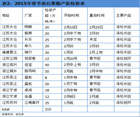 從上表我們也可以看出,聚酯產(chǎn)品價格跌幅明顯大于原料跌幅,所以其盈利空間縮窄,像聚酯瓶片和聚酯切片已處于虧損狀態(tài)。而隨著聚酯工廠庫存升高所帶來的壓力,部分工廠已作出應對措施,關于春節(jié)前后的檢修計劃也陸續(xù)對外公布。據(jù)安迅思不完全統(tǒng)計,2015年春節(jié)前后聚酯工廠檢修產(chǎn)能預計在310萬噸,主要以滌綸長絲工廠為主,約占檢修產(chǎn)能的84.8%;而部分工廠以減產(chǎn)降負為主,比如華星輪胎計劃減產(chǎn)250噸/天,華欣減產(chǎn)100噸/天。預計2月底,中國聚酯開工率將降至70%附近,具體工廠檢修計劃如下表。 經(jīng)過元旦之后,下游用戶多持觀望態(tài)度,市場成交氣氛偏淡,顯然新一輪的補貨周期已為期不遠,但是原油打壓,在一定程度也抑制了下游用戶的補倉舉動;臨近春節(jié),下游織造用戶也陸續(xù)開始放假,后期需求或?qū)⑥D(zhuǎn)淡,是否將有更多聚酯工廠加入檢修行列,下游用戶春節(jié)前的囤貨補倉力度將是主要因素。