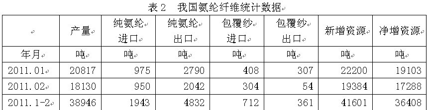 根據(jù)國家統(tǒng)計局和海關(guān)的統(tǒng)計數(shù)據(jù),我國2011年1-2月份氨綸纖維產(chǎn)量為3.89萬噸,同比增加0.10%;1-2月份進口氨綸纖維純氨綸0.19萬噸,出口0.48萬噸;進口包覆紗0.07萬噸,出口0.04萬噸;新增資源(產(chǎn)量+純氨綸進口+包覆紗進口)4.16萬噸,凈增資源(新增資源-純氨綸出口-包覆紗出口,即表觀需求)3.64萬噸,顯示中國氨綸纖維產(chǎn)業(yè)的市場需求較為強勁。
