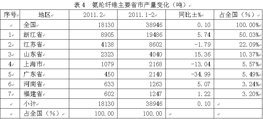 從2011年2月份的情況看,全國氨綸當月總產(chǎn)量為1.81萬噸,上述7大省市的當月產(chǎn)量合計為1.81萬噸,占全國當月總產(chǎn)量的100.00%;由此可見,我國前7大省市的氨綸產(chǎn)量約占全國總產(chǎn)量的全部。