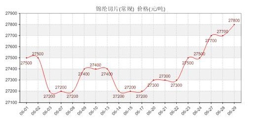 錦綸切片市場(chǎng)行情在經(jīng)歷了兩個(gè)多月的弱勢(shì)下滑走勢(shì)之后,在下游市場(chǎng)需求有所回升的推助下,以及上游原料市場(chǎng)成本支撐的帶動(dòng)下,近半個(gè)月以來錦綸切片市場(chǎng)價(jià)格穩(wěn)步上揚(yáng)表示。截至6月29日,華東地區(qū)錦綸常規(guī)紡切片一般出廠價(jià)格上漲至27800-28000元/噸;高速紡切片價(jià)格上漲至29300-29500元/噸三月承兌。