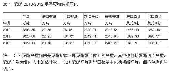 從產品供應和需求的變化情況看,聚酯產量從2010年的2293.35萬噸改變至2012年的3029.44萬噸,增加32.10%;進口數量從27.36萬噸改變至20.70萬噸,減少24.34%;出口數量從78.16萬噸改變至136.87萬噸,增加75.10%;表觀需求(產量+進口-出口)從2242.54萬噸改變至2913.27萬噸,增加29.91%;進口單價從1453.4美元/噸改變至1819.9美元/噸,增加25.22%;出口單價從1262.5美元/噸改變至1433.1美元/噸,增加13.51%。由此可見,聚酯產量和需求平衡發(fā)展,進出口單價體現了產品檔次和市場環(huán)境的綜合變化。