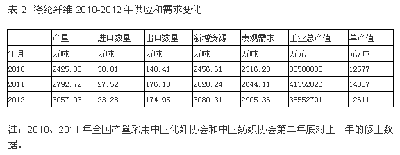 從產(chǎn)品供應(yīng)和需求的變化情況看,滌綸纖維產(chǎn)量從2010年的2425.8萬噸改變至2012年的3057.0萬噸,增加26.02%;進(jìn)口數(shù)量從30.81萬噸改變至23.28萬噸,減少24.45%;出口數(shù)量從140.41萬噸改變至174.95萬噸,增加24.60%;新增資源(產(chǎn)量+進(jìn)口)從2456.6萬噸改變至3080.3萬噸,增加25.39%;表觀需求(新增資源-出口)從2316.2萬噸改變至2905.4萬噸,增加25.44%;單產(chǎn)值(工業(yè)總產(chǎn)值/產(chǎn)量)從12577元/噸改變至12611元/噸,增加0.27%。由此可見,滌綸纖維產(chǎn)量和需求平衡發(fā)展,單產(chǎn)值的波動體現(xiàn)了產(chǎn)品檔次和市場環(huán)境的綜合變化。