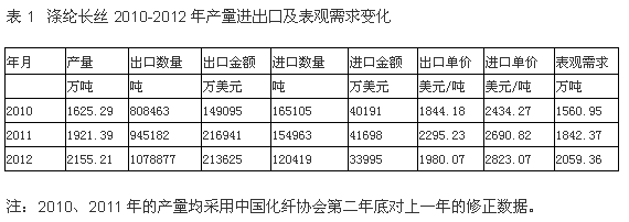 據(jù)國家統(tǒng)計局和中國海關(guān)公布的數(shù)據(jù),我國滌綸長絲產(chǎn)量從2010年1625.29萬噸,改變至2012年2155.21萬噸,增加32.60%;出口數(shù)量從80.85萬噸改變至107.89萬噸,增加33.45%;進(jìn)口數(shù)量從16.51萬噸改變至12.04萬噸,減少27.07%;表觀需求從1560.95萬噸改變至2059.36萬噸,增加31.93%;表明我國滌綸長絲出口高于進(jìn)口,產(chǎn)量除了滿足國內(nèi)市場旺盛的需求之外,還極大地滿足了國際市場的需求。
