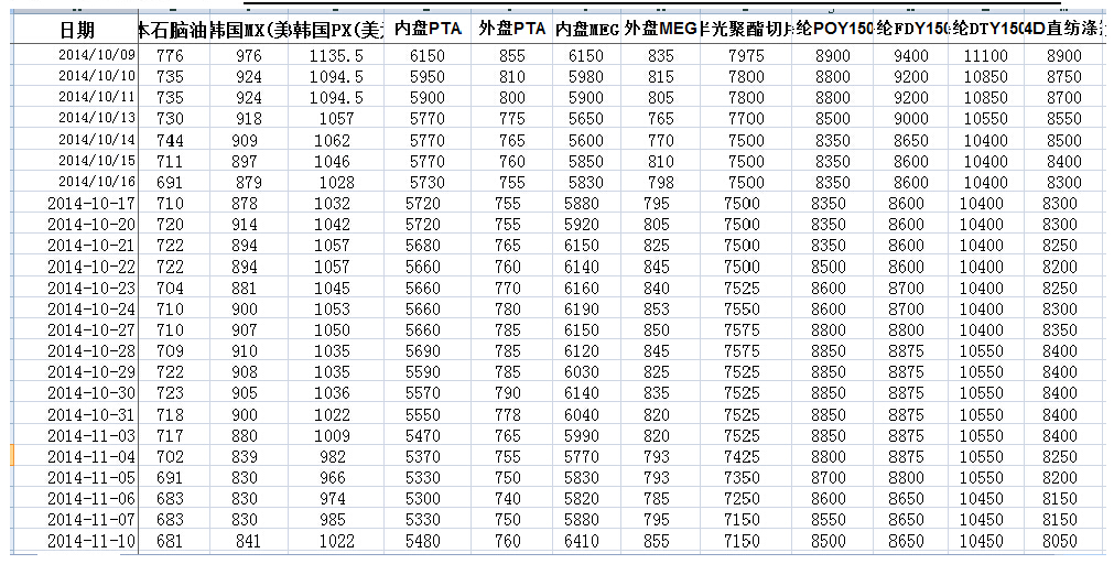 上一交易日原料信息