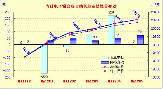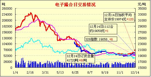 12月14日,全國棉花交易市場商品棉電子撮合交易成交21640噸,較上一日增加460噸,訂貨量增加60噸,累計(jì)訂貨41720噸。今日撮合高開震蕩向上,尤其是主力MA1204合同開盤即在20100元,其余合同也相對堅(jiān)挺,各合同小陽報(bào)收,漲幅45-102元不等;近月MA1112合同全天無成交,主力MA1204合同收于20140元,漲74元;盤內(nèi)最低價為MA1201合同開市價19550元,最高價為MA1205合同盤中價20250元;當(dāng)日成交量和訂貨量均有小幅增加。