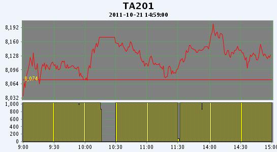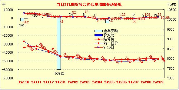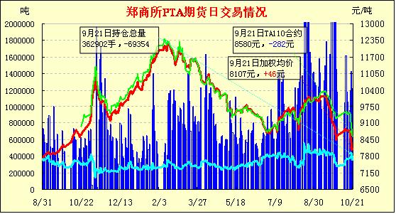 10月21日PTA期貨低開反彈,成交縮量,大幅減倉。當日各合約成交均價8107元/噸,漲46元。其中首期合約8580元/噸,跌282元;TA201合約8120元,漲46元;主力TA205合約7914元,漲12元。當日成交112.02萬手,減10.53萬手,成交金額454億元,減40億元。倉單總量36.29萬手。減倉6.94萬手。