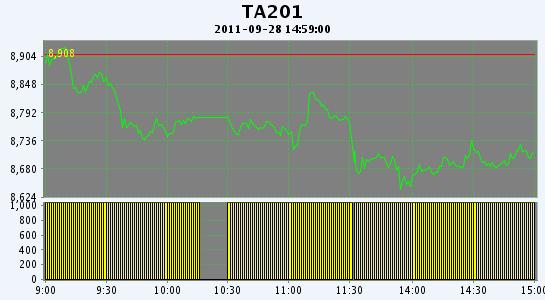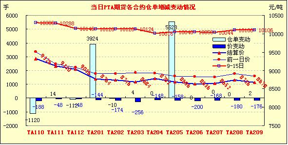 9月28日PTA期貨全線收跌,放量增倉(cāng)。當(dāng)日各合約成交均價(jià)8763元/噸,較昨日跌143元。其中首期合約9326元/噸,跌188元;主力TA201合約8764元,跌144元。當(dāng)日成交239.28萬(wàn)手,較昨日增加1.69萬(wàn)手,成交金額1048億元,是期棉市場(chǎng)163億元的6.4倍。當(dāng)日增倉(cāng)8230手,倉(cāng)單總量回升至33.57萬(wàn)手。
