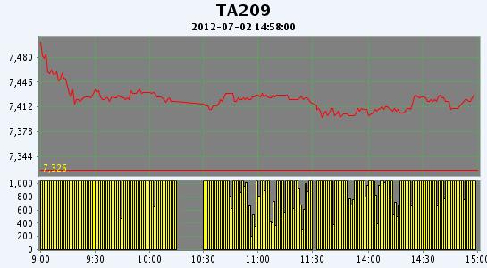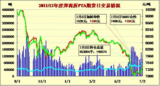 PTA雙底漸顯反彈啟動(dòng),備料需求或催生行情。宏觀利好、成本支撐、需求好轉(zhuǎn)、備料需求等利多因素將催生PTA三季度反彈行情。6月份PTA兩次探底,整體運(yùn)行節(jié)奏跟宏觀形勢(shì)密切相連:第一次探底是由于希臘退出歐元區(qū)風(fēng)險(xiǎn)增大,最低跌至6月12日的6964元;第二次探底是由于美國(guó)推出QE3的預(yù)期落空,全球經(jīng)濟(jì)前景依然存憂,最低跌至7000元/噸附近。而最近兩天,歐盟峰會(huì)達(dá)成救助協(xié)議,原油重回80美元/桶之上,這為PTA反彈創(chuàng)造條件。從技術(shù)形態(tài)看,如果PTA期價(jià)本周成功突破7350/噸元壓制,繼續(xù)走高的話,雙底形態(tài)就構(gòu)筑成功,后市將進(jìn)入上漲通道。