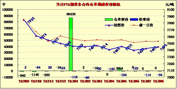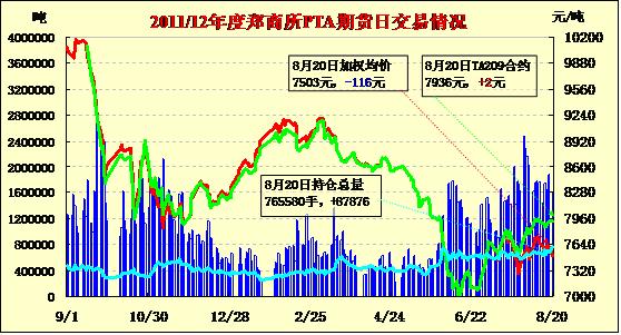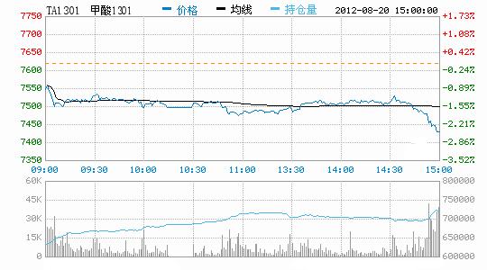 8月20日,PTA承壓下挫,持倉繼續(xù)增加。PTA1301合約開盤報7574元/噸,收盤報7430元/噸,較上一交易日下跌188元/噸,跌幅為2.47%。成交量回落至161.37萬手左右,持倉量增加86438手至71.98萬手。因傳聞美國可能釋出戰(zhàn)略石油儲備,NEMEX原油出現(xiàn)回落;亞洲PX現(xiàn)貨報價小幅回落,現(xiàn)貨動態(tài)利潤處于-300至-500元/噸。,部分新增PTA裝置可能陸續(xù)開車增加供應(yīng)壓力,PTA成本高企限制回調(diào)空間,延續(xù)弱勢震蕩走勢。PTA現(xiàn)貨市場報價下調(diào),市場呈現(xiàn)觀望,江浙市場滌絲行情僵持,下游詢盤氣氛一般。