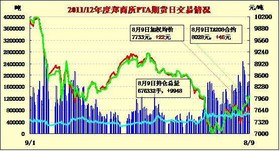 鄭州PTA1301合約開(kāi)盤(pán)報(bào)7700元/噸,收盤(pán)報(bào)7762元/噸,較上一交易日上漲52元/噸,漲幅為0.67%。成交量回落至154.42萬(wàn)手左右,持倉(cāng)量增加11374手至62.32萬(wàn)手。美國(guó)EIA原油庫(kù)存繼續(xù)下降,NEMEX原油沖高回落;亞洲PX現(xiàn)貨報(bào)價(jià)小幅下調(diào),現(xiàn)貨動(dòng)態(tài)利潤(rùn)處于-300至-500元/噸。國(guó)內(nèi)7月CPI繼續(xù)回落,貨幣寬松預(yù)期再啟,8月合同貨掛牌價(jià)報(bào)至7900-8000元/噸,臺(tái)風(fēng)對(duì)華東地區(qū)的PTA裝置及運(yùn)輸造成一定影響,預(yù)計(jì)短期PTA回調(diào)空間有限,延續(xù)震蕩上行走勢(shì)。PTA現(xiàn)貨市場(chǎng)報(bào)價(jià)持穩(wěn),成交清淡,聚酯工廠(chǎng)庫(kù)存處于低位,江浙市場(chǎng)滌絲行情平穩(wěn),下游采購(gòu)較為謹(jǐn)慎。PTA 1301合約收漲,期價(jià)回測(cè)5日線(xiàn)后震蕩上行,短線(xiàn)有望測(cè)試前期高點(diǎn)7900一線(xiàn)壓力。操作上,依托7600多單持有。