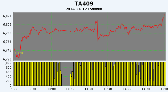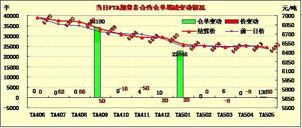 周四PTA主力合約高開6元,多頭增倉拉升價(jià)格,后緩慢減倉價(jià)格高位盤整。收于6824元/噸,上漲80元。主力合約1409合約成交量增加30.4萬手,持倉先增后減,最高增倉5.8萬手,后持續(xù)減倉,收盤時(shí)總體持倉增倉3.4萬手。