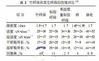 竹纖維和其它纖維的性能對(duì)比如表2所示 論從結(jié)構(gòu)上還是性能上都既有很多相似之處,又有不少各自的特點(diǎn)。竹纖維和粘膠纖維都有良好的吸濕性,但其吸濕機(jī)理有所不同。粘膠纖維良好的吸濕性得益于纖維較低的結(jié)晶度,而竹纖維是由于纖維內(nèi)孔隙多,在毛細(xì)管效應(yīng)的作用下,水分子容易進(jìn)入使得纖維吸放濕能力突出。由于竹纖維結(jié)晶度高于粘膠纖維因而強(qiáng)力比粘膠纖維高。一般纖維素纖維在細(xì)菌和霉菌這些微生物的分泌物酶作用下,易發(fā)生水解生成較簡(jiǎn)單的糖,導(dǎo)致纖維的強(qiáng)度受到嚴(yán)重?fù)p失。而竹纖維中存在天然抗菌的“竹醌”組分,賦予纖維天然抗菌、抑菌、防臭和抗紫外線的特性,其天然抗菌、抑菌、抗紫外線作用在經(jīng)反復(fù)洗滌、日曬后,仍能保持其固有的特點(diǎn),且不同于在后處理中加入抗菌、抗紫外線等整理劑的織物,不會(huì)對(duì)人體皮膚造成任何過敏性不良反應(yīng),是真正的保健產(chǎn)品。因此相對(duì)于棉、粘膠纖維,竹纖維具有天然抗菌性能和優(yōu)良的吸濕性、舒適性、透氣性、染色性、可生物降解性以及尺寸穩(wěn)定性。 表2竹纖維和其它纖維的性能對(duì)比