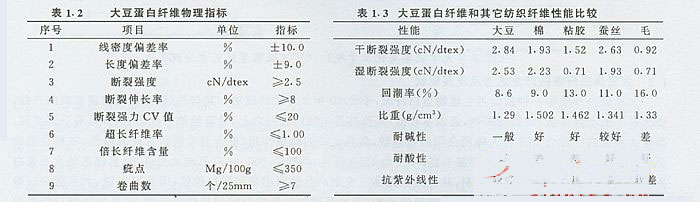 大豆蛋白纖維的基本物理性能指標(biāo)及與其它紡織纖維的性能比較,分別如表1.2和表1.3所示。