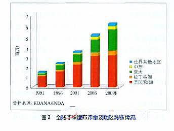 據(jù)Oerlikon (歐瑞康) 公司發(fā)布的2006/07纖維年報統(tǒng)計,2006年全球非織造布產(chǎn)量增長8 %,達(dá)到660萬t。而來自EDANA/INDA 的數(shù)據(jù)顯示,2006年全球非織造布產(chǎn)量為520萬t左右,這可能是統(tǒng)計口徑不同所致。 目前, 北美地區(qū)和歐盟各國是非織造布工業(yè)最發(fā)達(dá)的兩個區(qū)域, 其各自非織造布總產(chǎn)量約為140萬 ~ 150萬t/a, 亞太地區(qū),特別是中國是發(fā)展最快的區(qū)域, 其非織造布產(chǎn)能已經(jīng)超過歐盟,僅次于美國(圖2)。