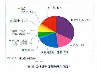![]() 在全球范圍內(nèi)的終端市場方面, 醫(yī)療衛(wèi)生領(lǐng)域是非織造布產(chǎn)品的最大市場, 占據(jù)33 %的份額, 其次是民用工程