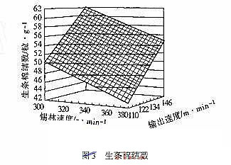 ![]() 從圖3可見:生條棉結(jié)數(shù)隨輸出速度(產(chǎn)量)增加而增多,這是因為隨產(chǎn)量增加,棉結(jié)平均受梳理時間減少,使棉結(jié)梳解的幾率降低。生條棉結(jié)數(shù)隨錫林轉(zhuǎn)速的增大而減少,這是因為錫林增速降低了梳理負(fù)荷,且棉結(jié)平均受梳理時間增加。生條棉結(jié)數(shù)與錫林轉(zhuǎn)速呈線性相關(guān),曲線中部無凹凸處,且無臨界點,說明C4型梳棉機(jī)的梳理場布置對附加棉結(jié)的控制是有效的。從棉結(jié)的角度看,在保證錫林、刺輥一定速比的條件下,刺輥轉(zhuǎn)速隨錫林同步增速仍有一定空間。