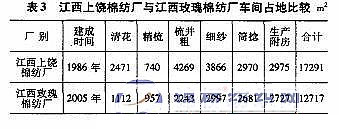 使用清梳聯(lián)機組,省去清棉成卷工序,節(jié)省機臺占地面積;采用優(yōu)質(zhì)高效高產(chǎn)梳棉機,減少機臺數(shù),減少占地面積,并采用自調(diào)勻整裝置提高生條質(zhì)量。表3為江西玫瑰棉紡廠與80年代建上饒棉紡廠各車間占地面積比較。