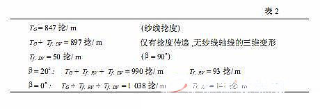 除了鋼絲圈β=0°時(shí)的紗線捻度和試驗(yàn)時(shí)的調(diào)節(jié)參數(shù),長絲的紗線捻度為:Tf=Tf..DV+Tf..RV=191捻/m。根據(jù)Pavlvo研究,由于三維變形在圓形環(huán)中產(chǎn)生的假捻可用公式
