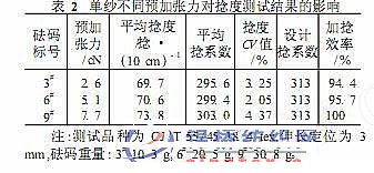 單紗預(yù)加張力=單紗公稱號數(shù)/4(單位為cN),雖然新型捻度儀張力作用裝置采用了盤式形式,但選擇預(yù)加張力砝碼后產(chǎn)生的單紗預(yù)加張力仍是符合上述公式要求的。現(xiàn)就利用Y331LN型捻度儀在相同的伸長定位參數(shù),不同單紗預(yù)加張力條件下,對同一管紗進(jìn)行捻度測試,結(jié)果見表2。