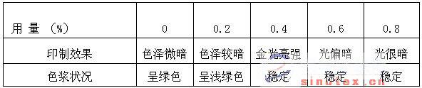 (3)抗氧劑的選擇和用量:金粉印花的亮度除了金粉和粘合劑的選擇和用量控制外,一般應(yīng)在金粉印花色漿中添加抗氧劑,避免金屬粉末在空氣中被氧化而使光澤變暗,抗氧劑可選用苯酚或亞硫酸鈉等,經(jīng)試驗,苯駢三氮唑的抗氧效果最好,因為它為銅的特效緩蝕劑,能與銅生成不溶性混合物,從而對銅起到了保護(hù)作用,表3為抗氧劑用量的選擇。