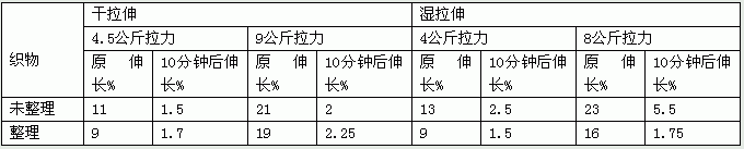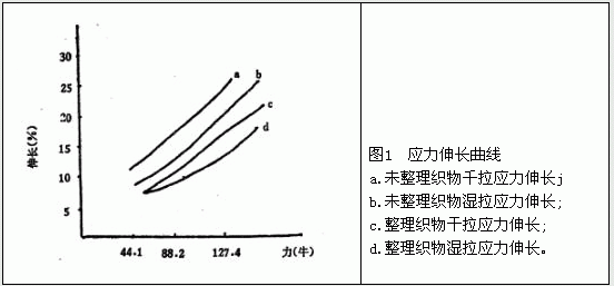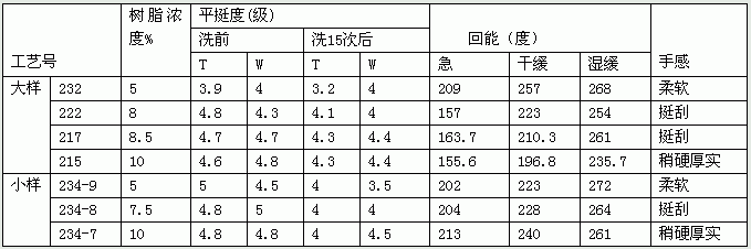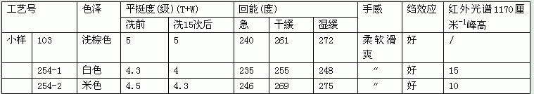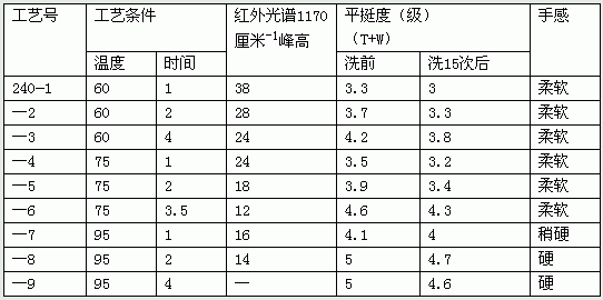 如圖1,拉伸回復(fù)性見表2。 表2 拉伸回復(fù)性 注:以上兩塊織物均為印花成品經(jīng)預(yù)縮后(縮水率為0%)測得。 從拉伸回復(fù)性的差別以可肯定,交鏈整理后的織物縮水率可以大大地低于不整理織物,但是如若最后一道工序加工張力較大時,織物的縮水率也仍然是很大的,它制約于拉伸回復(fù)率的特征。 四、織物免燙與風(fēng)格之間的矛盾和統(tǒng)一 1·樹脂用量對免燙、手感風(fēng)格指標(biāo)的影響 環(huán)氧化合物與真絲雙縐在特定的條件下可發(fā)生交鏈反應(yīng),并能賦予織物以免燙性能,主要是由于環(huán)氧化合物與酪氨酸的酚羥基反應(yīng)的結(jié)果[10],其它也還有賴氨酸、精氨酸、組氨酸和絲氨酸參與反應(yīng)的可能性。在試驗中我們發(fā)現(xiàn),樹脂的用量不同對免燙、手感風(fēng)格有重要影響,見表3。 表3 樹脂用量不同對免燙、手感鳳格的影響 注;以上均為半制品數(shù)據(jù),手感指標(biāo)為手的直觀感覺。 從表中看出,樹脂用量愈高,免燙性、耐洗性愈好,但與干、濕回能不成規(guī)律,手感風(fēng)格則有下降。 2·工藝條件對免燙、手感風(fēng)格的影響 環(huán)氧化合物與真絲雙縐的反應(yīng)在不同的時間、溫度下,可取得不同的整理效果,見表4。 表4 時間、溫度對免燙手感、風(fēng)格的影響 注;平挺度為半制品數(shù)據(jù)。 采用紅外光譜檢驗免燙效果的方法在后面我們將詳細(xì)論述,在此我們僅以1170厘米-1波峰的大小(即酪氨酸的交鏈情況,從0-70值小為好)來衡量交鏈度的好壞。從表中看出,經(jīng)75℃、3.5小時處理的織物的免燙性、交鏈度和手感都很好,而95℃、1~4小時處理,雖然免燙與交鏈效果甚好,但手感欠佳。 3·織物張力大小對免燙、手感風(fēng)格的影響 在選出最佳濃度、溫度、時間后,我們發(fā)現(xiàn)處理時的織物張力對免燙、手感風(fēng)格、縐效應(yīng)的指標(biāo)平衡起著至關(guān)重要的作用。我們在大樣中曾采用織物浸軋樹脂工作液后上卷汽蒸,由于工業(yè)化生產(chǎn),進(jìn)布時張力一般都比小樣大一些。織物雖然也是在濕狀態(tài)下與環(huán)氧化合物反應(yīng),但卻是在緊張狀態(tài)下的濕交鏈。翻理后織物很難回復(fù)原先的自然狀態(tài),真絲雙經(jīng)的縐效應(yīng)很難保證。嚴(yán)重的是,即使真絲雙絕能夠達(dá)到防縮免燙的要求,如果雙給的特色有所損害,就會失去實用價值。 4·不同工藝方法對織物免燙、手感風(fēng)格的影響 在研究過程中。我們選擇的工藝流程是;煉白綢軋膨化劑或催化劑→烘干→浸環(huán)氧樹脂工作液汽蒸→水洗→烘干→染色或印花→添加劑整理,其中先后試用過三種整理工藝方法, (1)浸泡法: 浸泡法是先將織物軋膨化劑,烘干打卷后浸入用溶劑烯釋的樹脂液中,濕反應(yīng)2-4小時而后染色印花。整理效果見表5。 表5 浸泡法工藝效果 但此工藝方法由于樹脂分布難以均勻,直接印花尚可,染地與染色加工色差、色花比較嚴(yán)重,平挺度指標(biāo)波動較大,無法正常生產(chǎn),因此浸泡法工藝已不采用。 (2)施加器法, 施加器法是先將織物浸軋催化劑,烘干后織物用圓弧刮刀施加器給液,而后上卷汽蒸。這個工藝方法的試驗數(shù)據(jù)見表1、表2。 (3)二浴法, 二浴法是織物浸軋催化劑烘干后,在松式狀態(tài)下上卷,同時浸漬樹脂液汽蒸反應(yīng)。這一方法可使織物在自然和松馳狀態(tài)下發(fā)生交鏈,使織物可獲得防縮兔燙的效果,又保證了縐效應(yīng),也使真絲綢雙縐柔軟活潑的風(fēng)格得到了良好的保持。其綜合指標(biāo)見表6。 表6 二浴法工藝效果 |