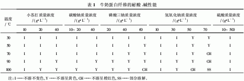 2 結(jié)果與討論 2·1 pH值的影響 2·1·1 牛奶蛋白纖維的耐酸堿性 為了確定適合牛奶蛋白纖維染色的pH值范圍,首先探討牛奶蛋白纖維的耐酸、耐堿性。結(jié)果如表1所示。