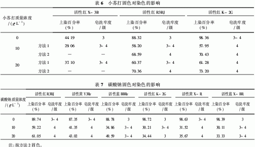 實(shí)驗(yàn)中發(fā)現(xiàn),染色30 min后,直接往染色殘液中加入小蘇打會有大量氣泡放出,這是因?yàn)樾√K打與染浴中的酸發(fā)生了反應(yīng),所以采用方法2進(jìn)行固色,而且方法2的上染百分率要高些,這主要是堿劑用量相對增加的緣故。