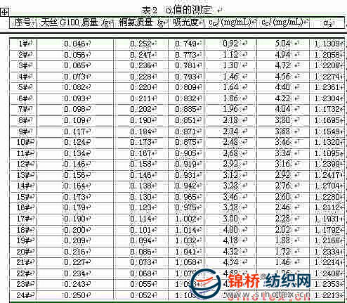 一個(gè)訓(xùn)練集,如表2所示。將每個(gè)樣品用50mL65%硫酸處理,在444nm處測(cè)定溶液的吸光度值。根據(jù)方程(4)、(5)分別計(jì)算出該配比下各自的吸光度,再根據(jù)公式(2)計(jì)算每個(gè)配比下的ai值,見(jiàn)表2。從表2可以看出,計(jì)算得到的ai值分布范圍較窄,為1.1095~1.2704,其平均值為1.2064,RSD為3.38%。該平均值a即可用于根據(jù)方程(3)來(lái)計(jì)算未知配比的天絲G100/銅氨混合物的混紡比。"