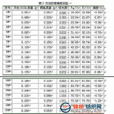 4.3準(zhǔn)確度實(shí)驗(yàn) 本文采用該方法對(duì)已知配比的天絲G100/銅氨二元混合物進(jìn)行測(cè)定,根據(jù)計(jì)算得到的天絲G100的配比FM與實(shí)際配比FJ的差異來(lái)判斷方法的準(zhǔn)確度。 分別稱(chēng)取天絲G100纖維和銅氨纖維,設(shè)計(jì)了一系列不同配比的天絲G100/銅氨混合物。所有樣品經(jīng)50mL65%硫酸處理后,在444nm處測(cè)定溶液的吸光度值,結(jié)果見(jiàn)表3。根據(jù)混合物的總濃度和線性方程(4)、(5)分別計(jì)算出此濃度的天絲G100和銅氨纖維的吸光度。利用吸光度值,根據(jù)方程(3)計(jì)算天絲G100的配比FM。計(jì)算FM與真實(shí)配比FJ的偏差。從表3的數(shù)據(jù)可以看出,分析結(jié)果與實(shí)際配比的偏差范圍為-1.67~1.80。根據(jù)FZ/T01053-2007《紡織品纖維含量的標(biāo)識(shí)》的規(guī)定,紡織品成分分析結(jié)果應(yīng)該在±5%的允差范圍內(nèi)。因此采用分光光度法對(duì)已知比例的天絲G/銅氨二組分混合物進(jìn)行定量分析,實(shí)際測(cè)量結(jié)果的比例誤差全部在標(biāo)準(zhǔn)的允差范圍內(nèi)。