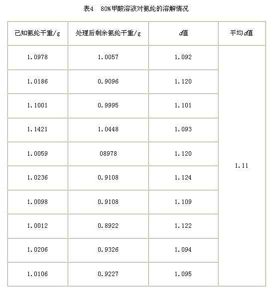 從表3來看,我們在不考慮80%甲酸對氨綸的影響時(shí),按d值取1.00進(jìn)行計(jì)算,結(jié)果氨綸重量損失百分率在-1.1%~-2.5%之間。這說明甲酸溶解氨綸時(shí)對錦綸的影響較大。