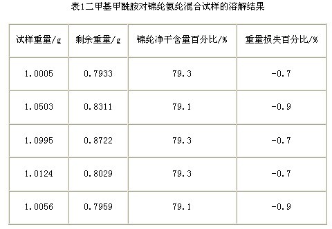 從已知干重的試樣中用二甲基甲酰胺把氨綸纖維溶解,使兩種纖維分離,將不溶纖維清洗、烘干、冷卻稱重,計(jì)算出各組分的含量百分率。