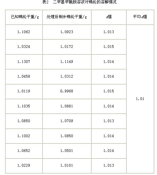 從表1來看,我們在不考慮二甲基甲酰胺對錦綸的影響時(shí),按d值取1.00進(jìn)行計(jì)算,結(jié)果錦綸重量損失百分率在-0.7%~-0.9%之間。這說明二甲基甲酰胺溶解氨綸時(shí)對錦綸有一定的影響。通過對錦綸在二甲基甲酰胺中的重量損失d值進(jìn)行了求解試驗(yàn)(見表2),求得d為1.01,證明了上述觀點(diǎn)。按d值為1.01計(jì)算,則錦綸/氨綸百分含量與配比一致,接近真值。