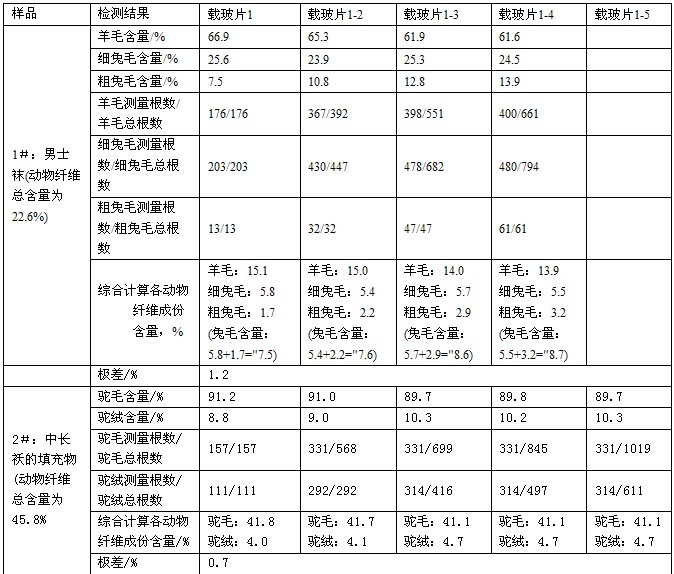 ?、塾枚喙δ茱@微投影儀依據(jù)GB/T16988-1997對各種動物纖維進(jìn)行檢測,方法是:檢測第一個載玻片上的各種動物纖維后綜合計算出各動物纖維的含量,再在第一個載玻片上的基礎(chǔ)上接著檢測第二個載玻片上的各種動物纖維后綜合計算出各動物纖維的含量,再在此項基礎(chǔ)上檢測第三個載玻片上的各種動物纖維后綜合計算出各種動物纖維的含量,以此類推,直到所測動物纖維總根數(shù)達(dá)到了1500根。所得數(shù)據(jù)列入表1。