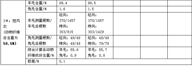 從表1中可以看出:1#樣品所制的4個載玻片,經(jīng)綜合計算所得各動物纖維成份含量的極差為1.2%;2#樣品所制的5個載玻片,經(jīng)綜合計算所得各動物纖維成份含量的極差為0.7%;3#樣品所制的2個載玻片,經(jīng)綜合計算所得各動物纖維成份含量的誤差為0.1%,均滿足本標(biāo)準(zhǔn)的要求,即兩次計算結(jié)果的差異不大于3%滿足FZ/T01053—2007《紡織品纖維含量的標(biāo)識》中規(guī)定。筆者分析:這正說明了每一個載玻片上的纖維根數(shù)遠(yuǎn)遠(yuǎn)超過了1500根,包括了各種動物纖維和化學(xué)纖維,只不過用顯微投影儀測定的是其中的動物纖維的直徑根數(shù)和計數(shù)根數(shù),也就是說在每一個載玻片上的動物纖維測試完畢后不管動物纖維有幾種以及每一種動物纖維有多少根,實際上檢測過的纖維總根數(shù)遠(yuǎn)遠(yuǎn)超過了1500根了。