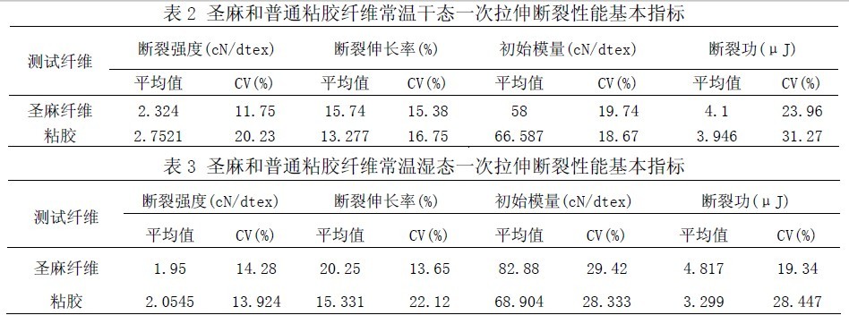 3.1一次拉伸斷裂性能圣麻纖維和普通粘膠纖維在干態(tài)和濕態(tài)下一次拉伸斷裂性能基本指標(biāo)見表2和表3。